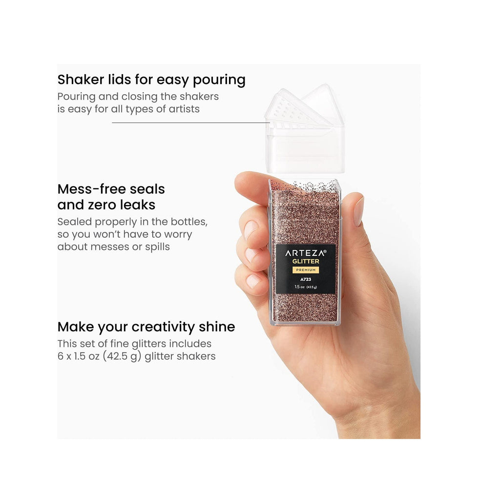 — Shaker tops that easily pour, but don’t spill easily. — Every bottle is sealed so that you won’t experience any leaks.-Unique Colors That Can Be Used Year-Round: We’ve created this set of 6 metallic colors of extra-fine glitter that can be used for arts and crafts year-round for all seasons and all holidays. -Easy-to-Pour Shakers with Snap Closures: Our team designed our craft glitter shakers so that pouring and closing the shakers is easy for artists of all ages. -Mess-Free Seals, Zero Leaks: We made sure that all of our fine glitter for crafts is sealed properly in the bottles, so you won’t have to worry about messes or spills.