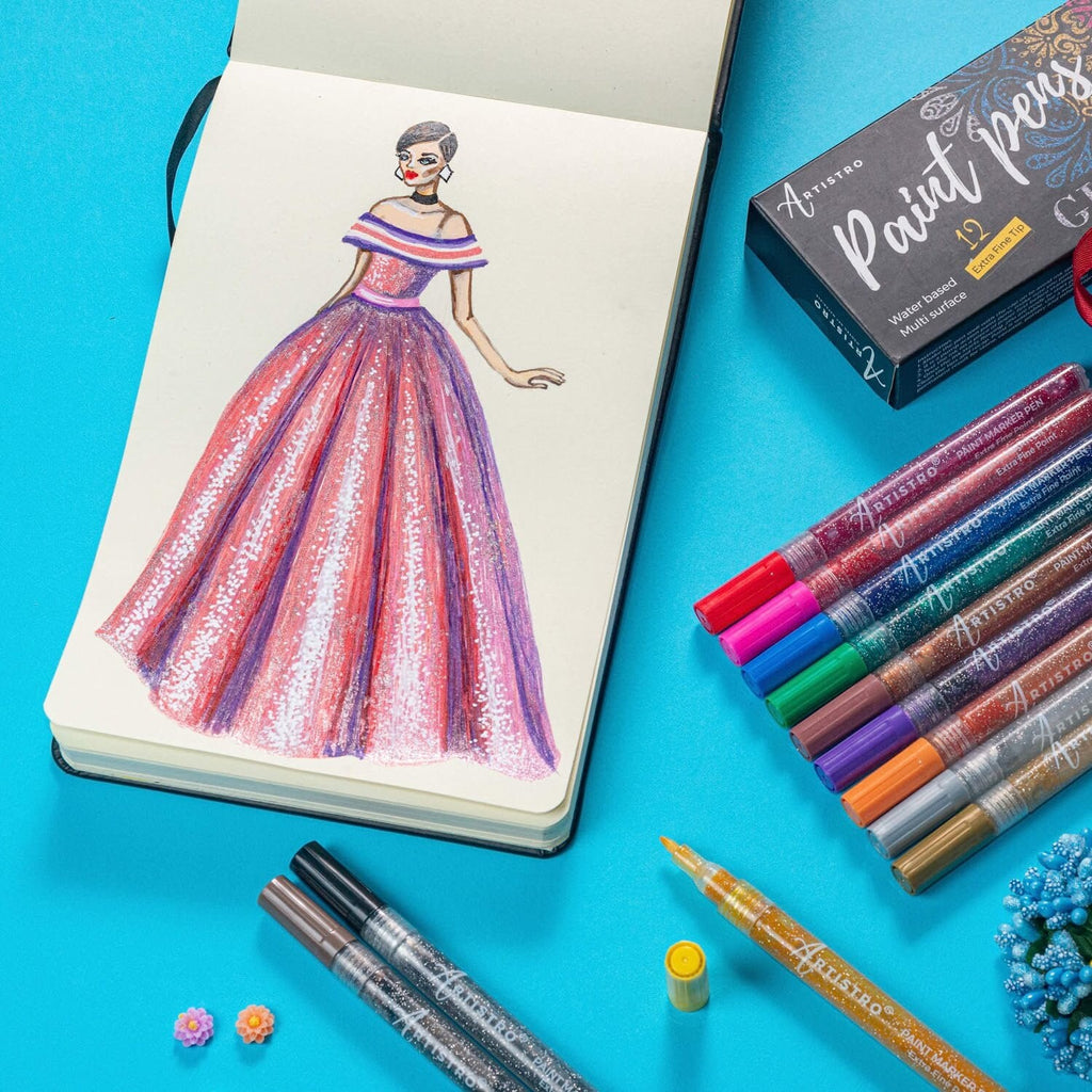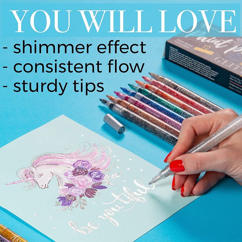 Premium Quality: Artistro glitter pens use vivid, highly pigmented acrylic glitter paint, designed for paper projects that won't bleed through paper. These glitter markers have a Japanese nib and Italian ink.