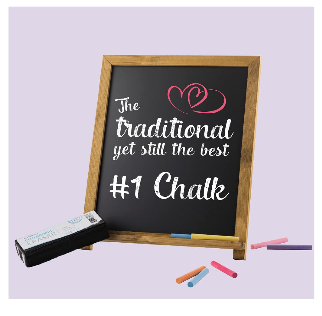 -Economical pack of white and colored chalks for work or play:This premium chalk set leaves others in the dust!-Gone are the days when a cloud of dust followed you after using a whiteboard.-Our chalkboard chalk features dust-free chalk that writes smoothly and erases cleanly.-The rich shades of red, blue, yellow, green, pink and purple will take your chalkboard creation to the next level.-This chalk is ideal for a wide variety of spaces and uses.-Whether you use it in a classroom, a cafe, an office, or just for fun, you can be sure it will help you make your mark on the world.-Drawing with chalk is not only for children. Creating chalk art is extremely relaxing, making it a unique and fun way for adults to wind down after a long day.-The fine chalks and eraser are easy and comfortable to hold for toddlers, kids, teens, and adults alike.-In addition to markers and crayons, colored chalk is a great way to keep your kids busy and entertained, but it's also a great way to help them stay interested in learning.
