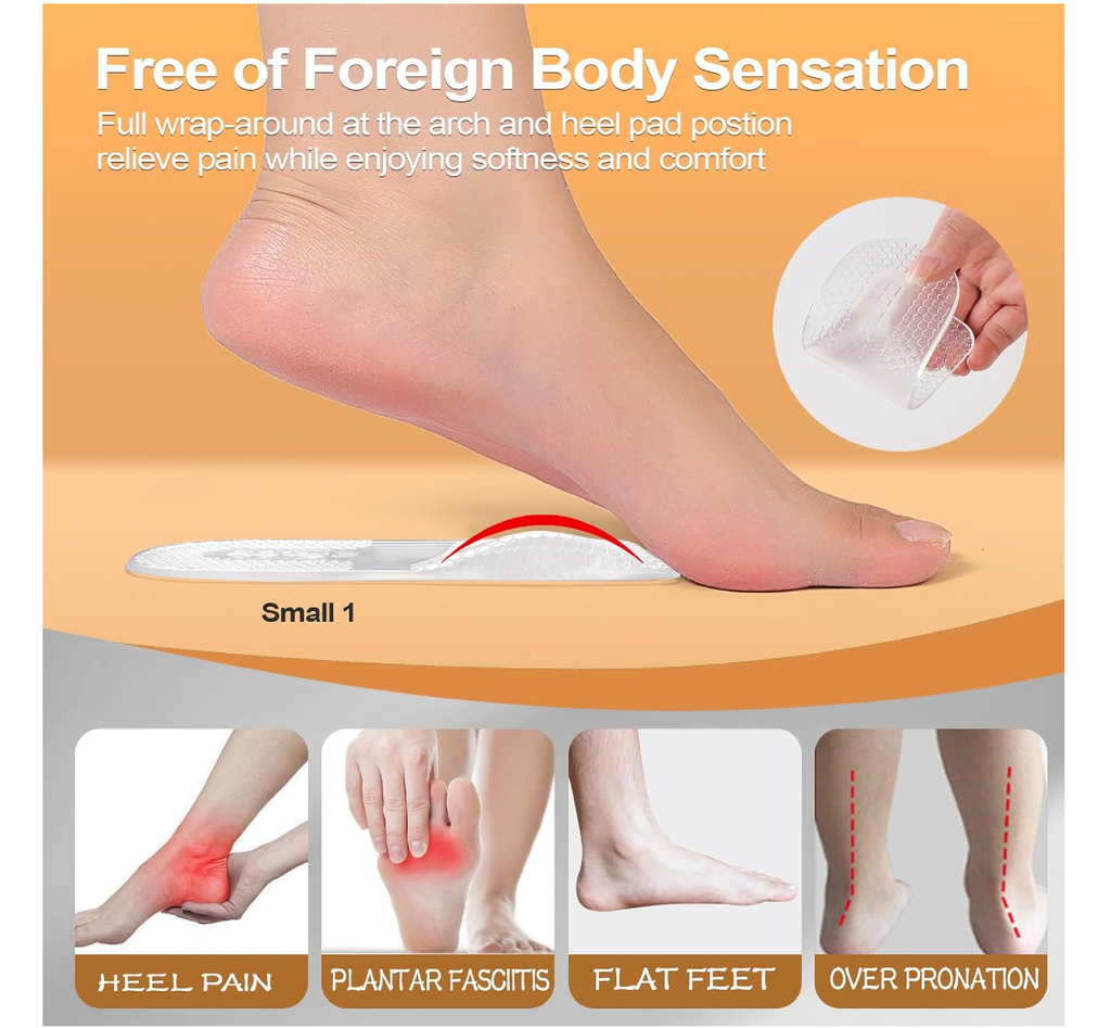 [Soft Gel Material for All-Day Comfort] Made from premium PU gel, these arch cushions mold to your foot shape, ensuring personalized support. The soft and flexible material absorbs shock and reduces discomfort from prolonged wear.