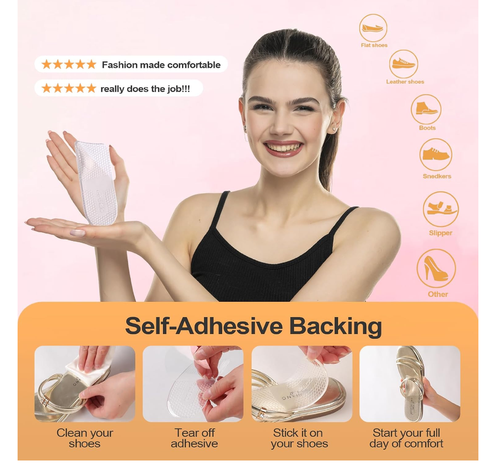 [Non-Slip & Self-Adhesive Design] Featuring a self-adhesive, non-slip design, these inserts stay securely in place inside your shoes. They can be easily repositioned and reused without leaving any residue.