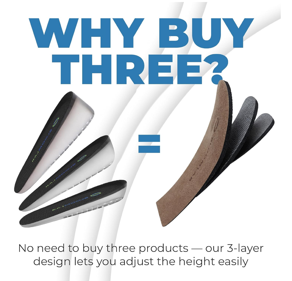 Adjustable 3 x 1/8" Layers: Exact Height Customization: Three removable layers let you fine-tune lift in precise 1/8" increments clear printed guide and QR-video ensure correct “stack or remove” setup without bulky orthotics or specialist visits.