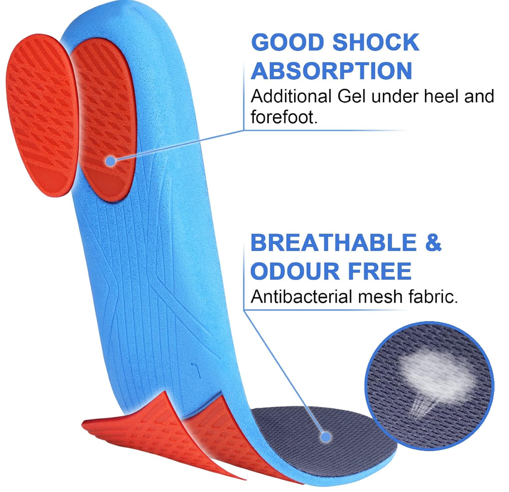 -SUPER SHOCK ABSORPTION: The elastic PU insoles with GEL pad under heel and forefoot are designed specifically to fully absorb shock and reduce stress on feet with every step. It is suitable for high-intensity exercise and helping reducing exercise-induced fatigue, like shin splints, runner's knee, plantar fasciitis.