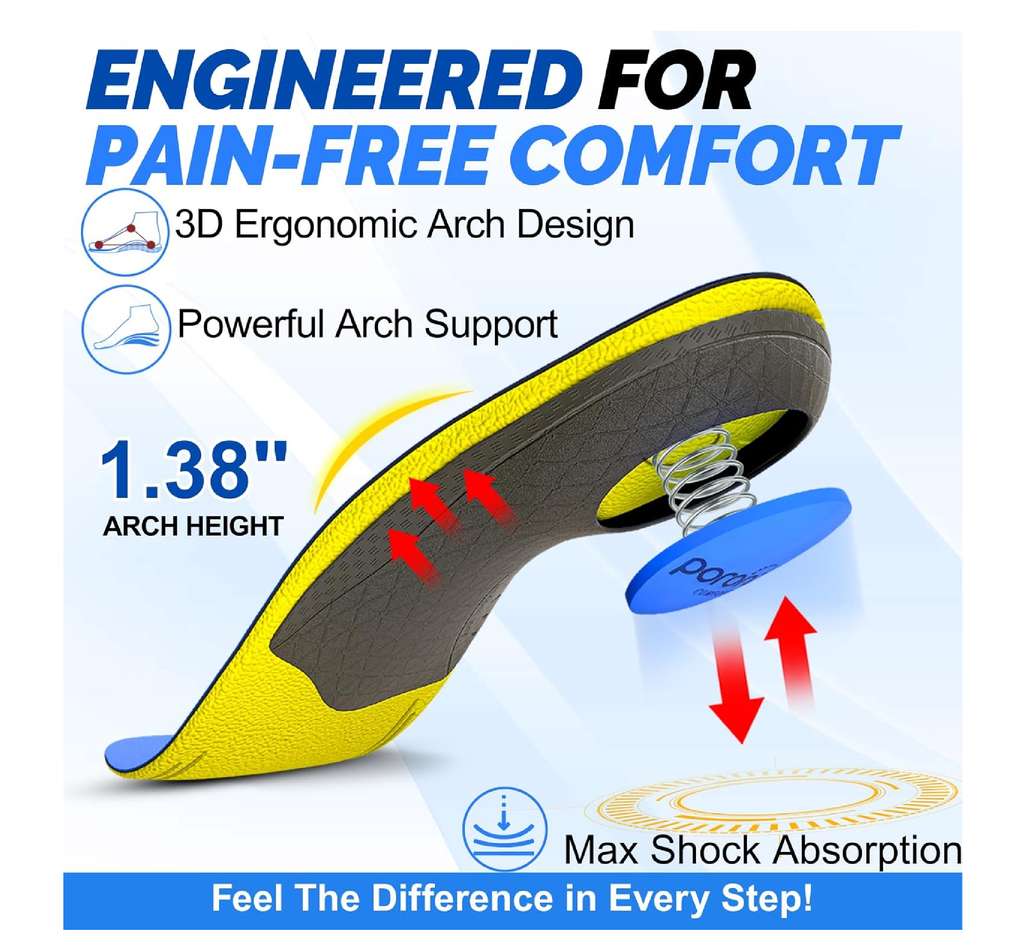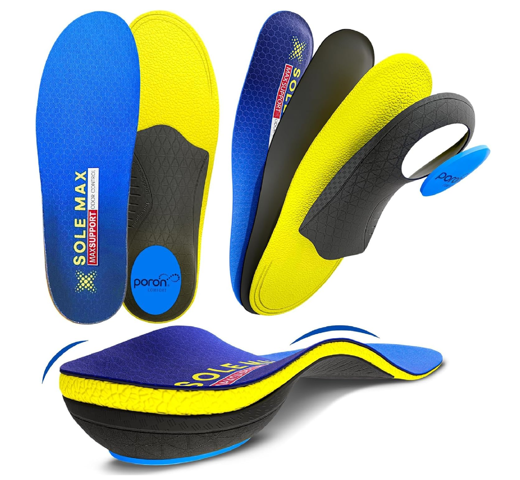 Total Body Alignment & All-Day Comfort for Active Lifestyles SOLE MAX insoles help prevent and relieve foot issues like plantar fasciitis, heel pain, and arch discomfort. Their sturdy construction and strong arch support improve foot stability, evenly distribute body weight, and reduce stress on the back, knees, and ankles. Used and loved by nurses, construction workers, delivery drivers, and athletes, these insoles deliver superior shock absorption and long-lasting comfort for anyone who stands, walks, or runs all day—designed for both men and women.
