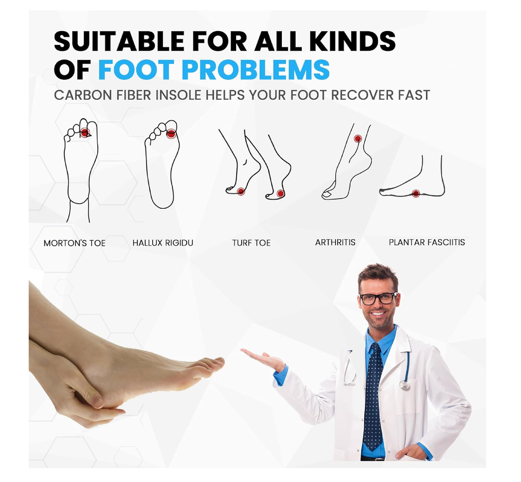 𝑭𝒐𝒐𝒕 𝑷𝒂𝒊𝒏 𝑹𝒆𝒍𝒊𝒆𝒇 Carbon fiber insoles are 1 mm thick and are designed to minimize flex (minimal flexibility) while optimizing stability. The rigid insole reduces pressure between the joints and toes, helping to alleviate foot pain such as turf toe, Hallux Limitus, Hallux Rigidus, plantar fasciitis, big toe pain, mid-foot arthritis, forefoot trauma - toe sprains. The insoles still allow some degree of movement, but reduce the pain associated with too much movement.