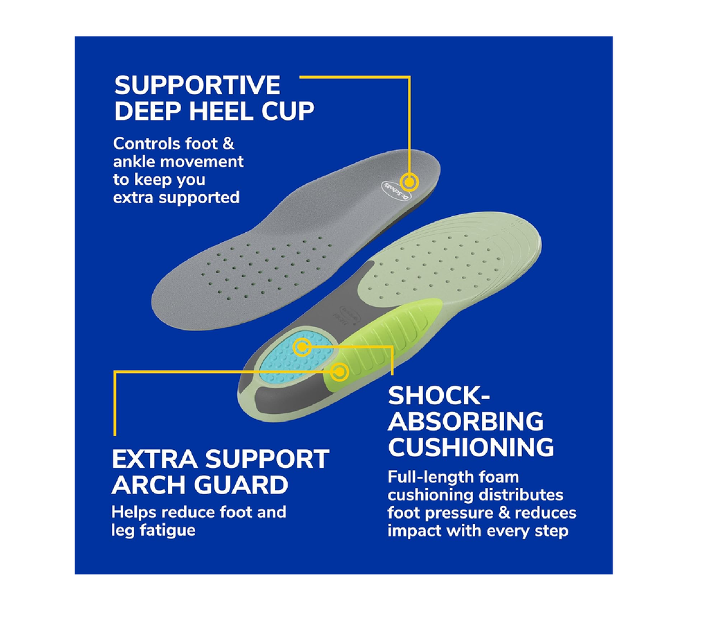 SHOCK ABSORBING TECHNOLOGY: Dr. Scholl’s Extra Support Insoles are crafted to help distribute foot pressure evenly, lessen the impact of each step, and absorb shock, allowing you to move with greater support and comfort throughout the day.