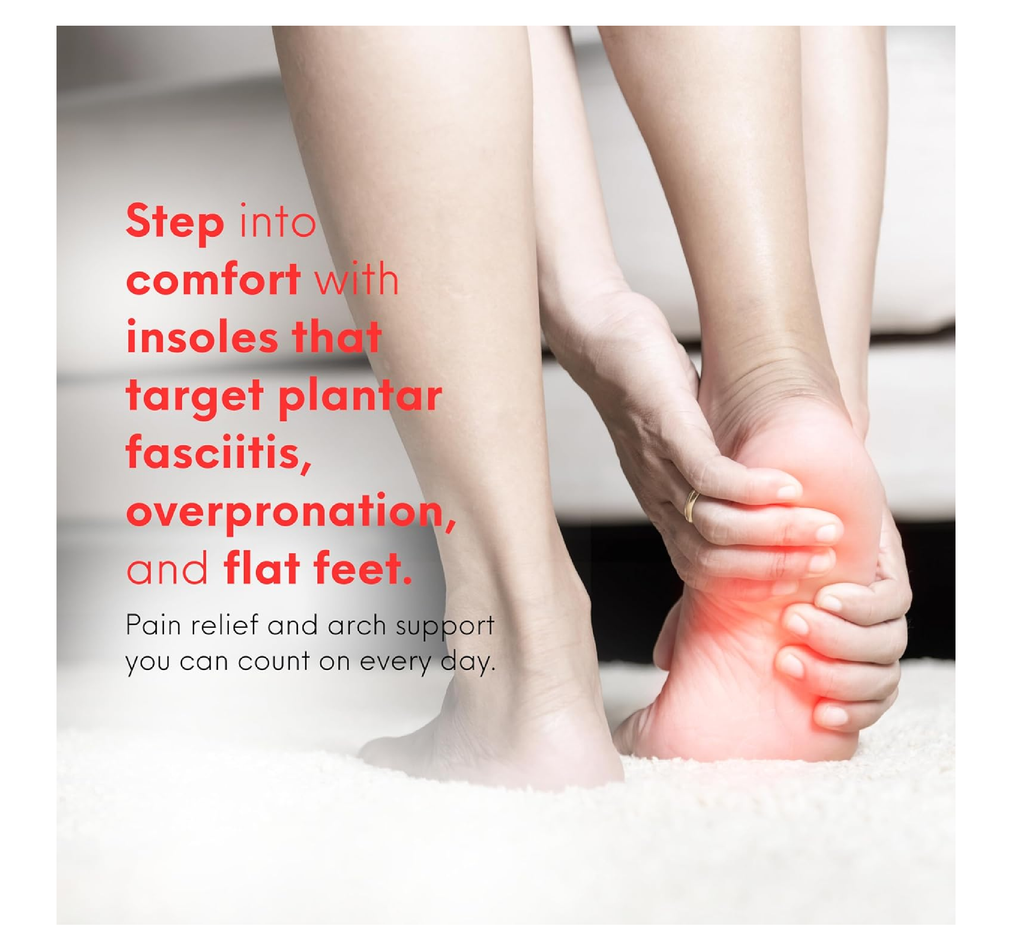 PAIN RELIEF & ARCH SUPPORT INSOLES: Offering firmer, thicker material at the arch, these foot insoles for men deliver targeted pain relief for flat feet and plantar fasciitis. They help alleviate discomfort from overpronation and provide medical-grade support.