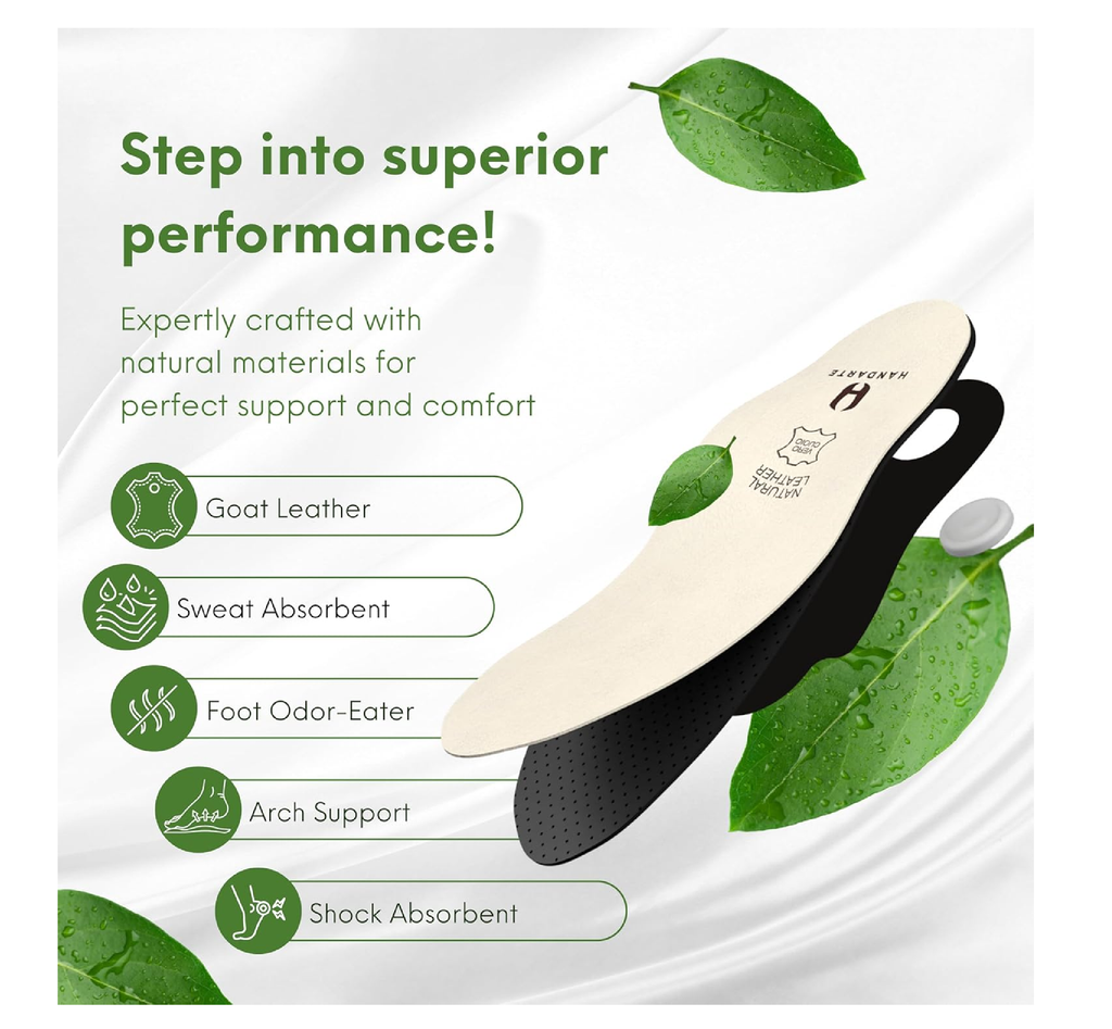 BREATHABLE & SWEAT-ABSORBING INSOLES: Designed with perforated goat leather, our insoles for men & women absorb sweat instantly, keeping your feet dry all day. The breathable materials and larger pores ensure a cool, odor-free environment for maximum comfort.
