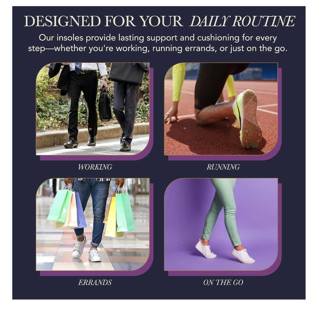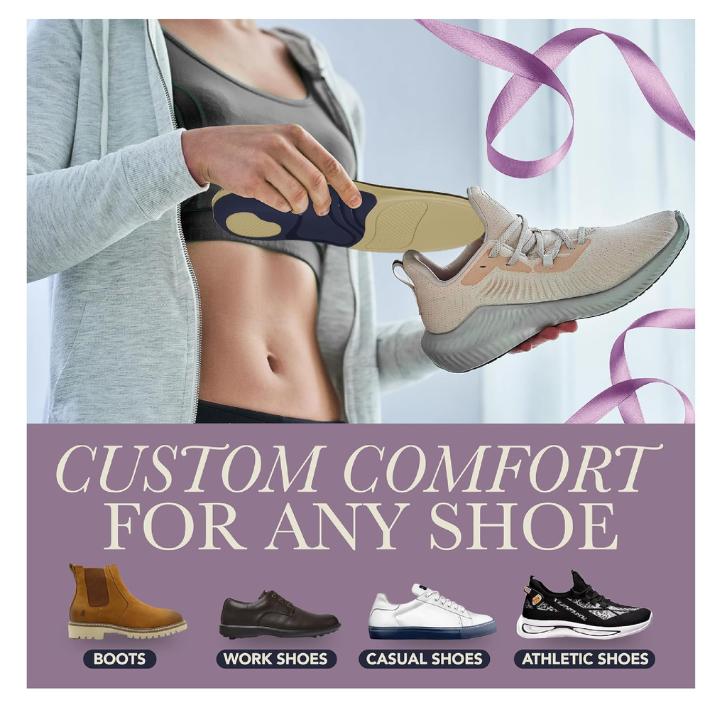 -PERSONALIZED FIT FOR ANY SHOE: Designed to fit a variety of footwear, our custom insoles provide the support you need, whenever you need it. Simply trim the toe end of these shoe inserts men & women to cushion and move with you all day long.