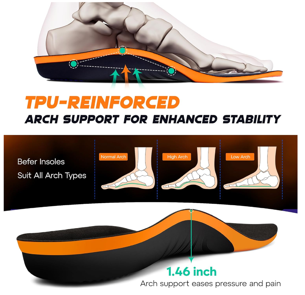 -The GEL shock-absorbing pad cushions each step, while the TPU arch support provides stability and rebound for long-lasting comfort. -These insoles help alleviate foot pain, including plantar fasciitis, overpronation, and other common foot issues, delivering effective foot pain relief throughout the day