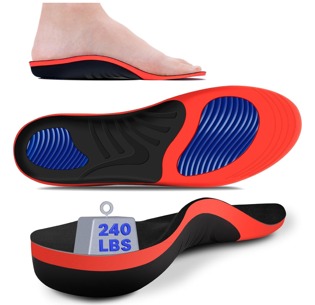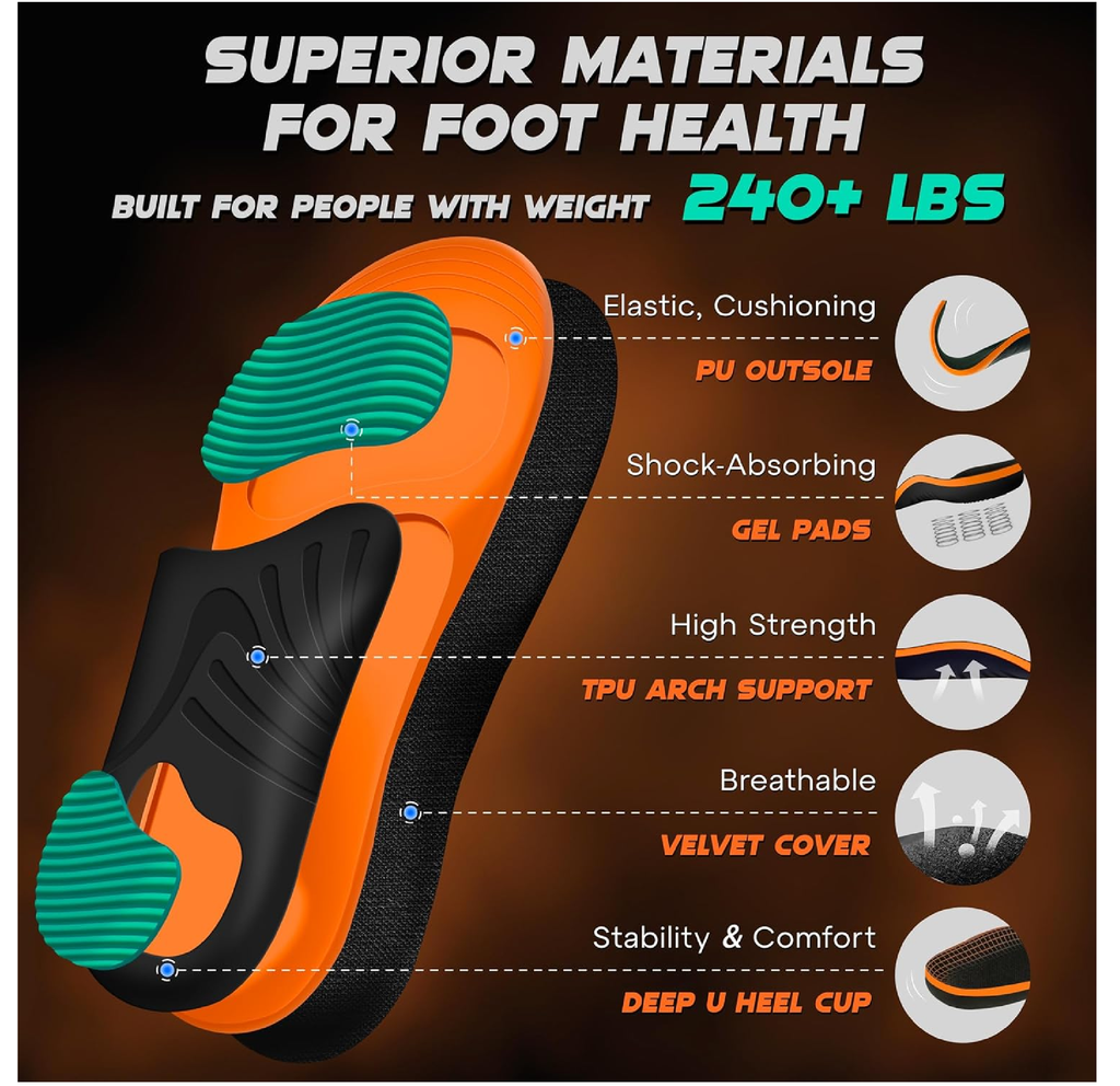 -Engineered for Support: Specifically designed for individuals weighing over 240 lbs, these unisex shoe inserts for women and shoe inserts men feature a high 1.46-inch arch to provide powerful arch support.