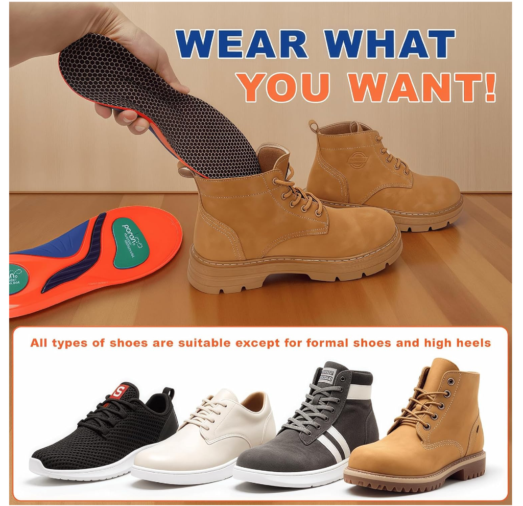 -Easy-to-Cut Custom Fit - Pre-scored edges allow hassle-free trimming to perfectly match your shoe size. Works with work boots, hiking shoes, dress shoes, even everyday sneakers. Whether you need trim-to-fit work boot insoles, plantar fasciitis insoles for men, or shoe insoles for standing all day—it fits.