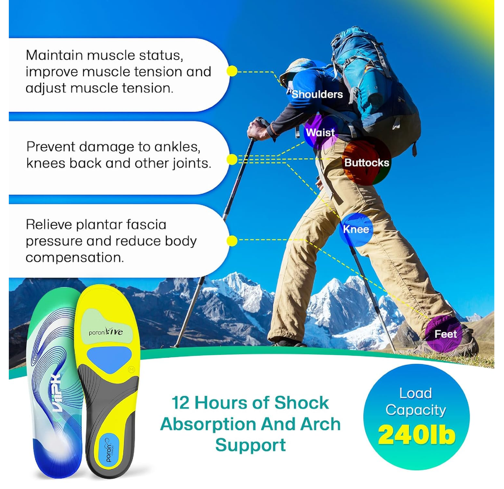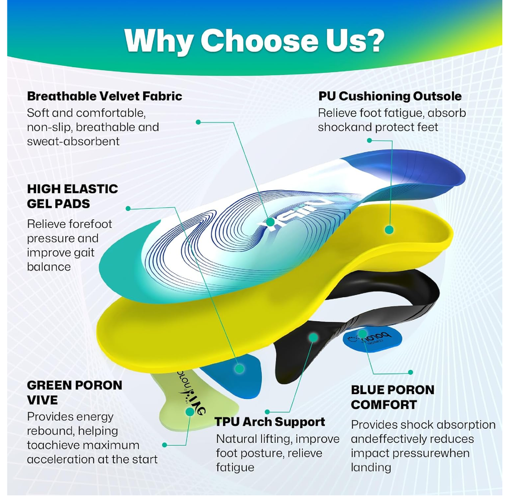 -Upgraded Triple Cushioning Shock Absorption: Our shoe insoles for men women are made of high-quality American PORON padding: blue PORON COMFORT provides cushioning and shock absorption, and green PORON VIVE provides high resilience. And it is additionally equipped with a high-elastic gel pad to provide additional cushioning and shock absorption for the forefoot. Bring you a comfortable experience.