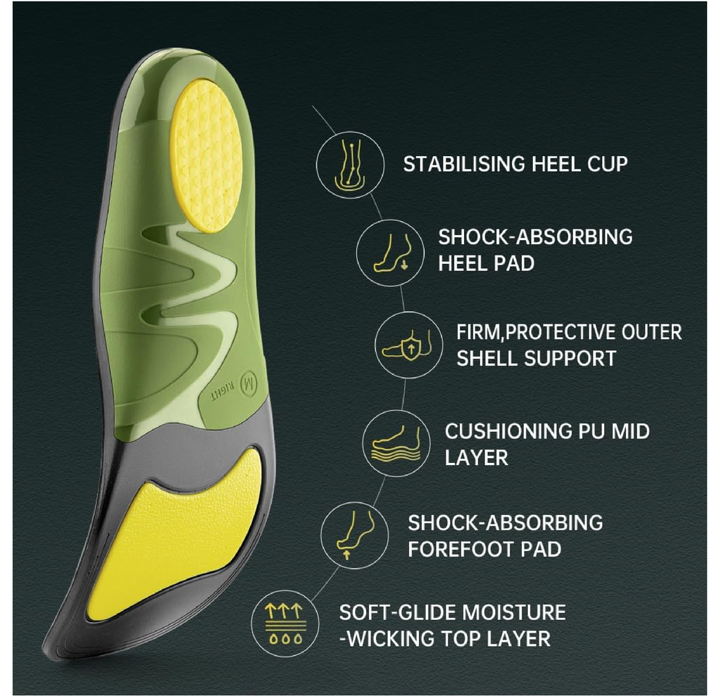 -Stand All Day: Forefoot pad provides extra cushioning, shock absorption and metatarsal pain relief for the front of your foot; Heel pad helps absorb heel impact, reduce heel pain and provide additional cushioning and comfort; Provides stronger Arch support helps correct and improve walking gait and posture, relieve and prevent foot pain. Supports the arch and wraps the heel while running or jogging. Has maximum cushioning effect, maintains verticality and balance, and provides stability.