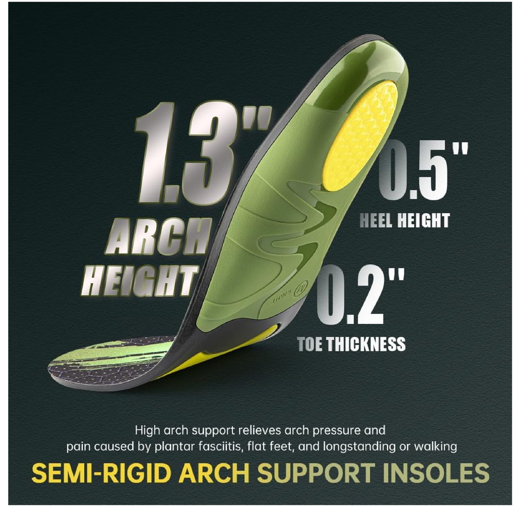 -Orthopedic Insole: Provides rigid arch support to help realign the entire body and reduce overstretching in plantar fasciitis. Helps relieve pain caused by plantar fasciitis, flat feet, high arches, ball of foot pain, ankle pain, metatarsal pain, arch pain, heel pain. Provides the right amount of relief, control and support while working and standing, as well as comfort and cushioning for everyday use.