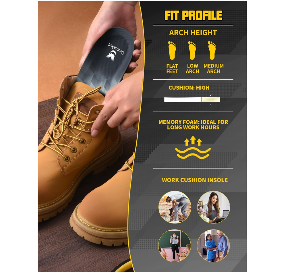 Suitable for Work Boots. Uvaluefeet work insoles are designed for both men and women, fitting various types of work boots and work shoes for all-day wear. Our work boot insoles can be trimmed to fit your shoes perfectly, so you don’t have to worry about sizing issues.