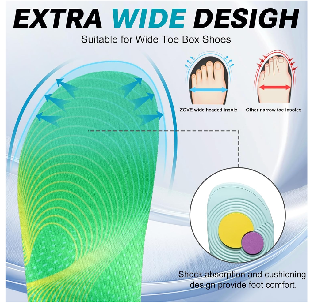 -Unisex wide-fit insoles: ZOVE wide insoles for men and women feature an expanded toe box and arch support chamber to prevent constriction, alleviate swelling, and relieve bunion discomfort.