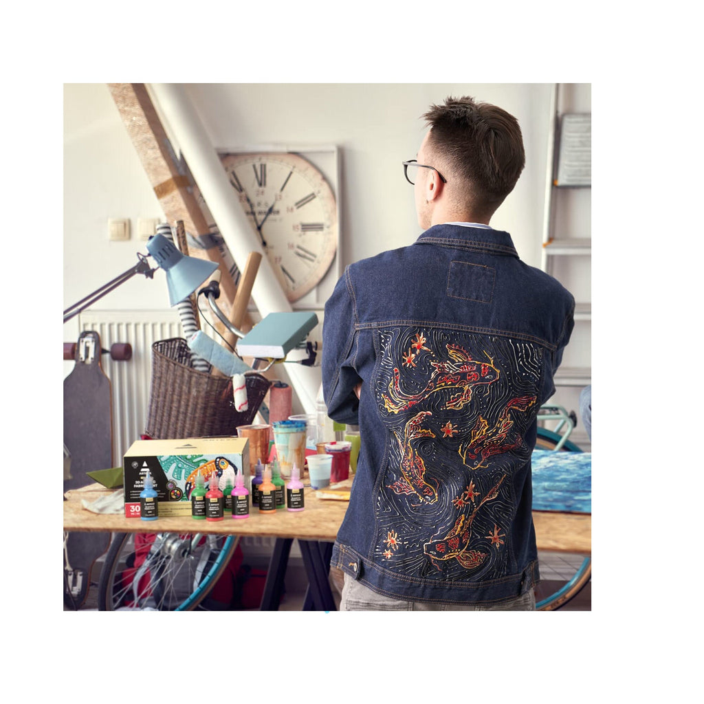 Bursting with Fantastic ColorThis set of 3D fabric paints includes 30 vibrant hues. Each box contains 7 metallic colors, 5 flourescent colors, a glitter color, and a glow-in-the-dark color.Each paint comes in its own individual tube with a precision tip that’s easy to squeeze just the amount you need, without spilling.What We Love about Our 3D Fabric Paint:-Produces a 3D effect when dried.-Tough and flexible, retains its color after many washes.-Unique Set of 30 Different Nontoxic Paints: Our set of textile paint features vibrant colors, metallic colors, fluorescent colors, as well as 1 glow-in-the-dark and 1 glitter color.-Permanent, Won’t Crack or Wash Off Easily: We formulated our fabric & textile paints to stay, so your work of art won’t get lost in the wash.