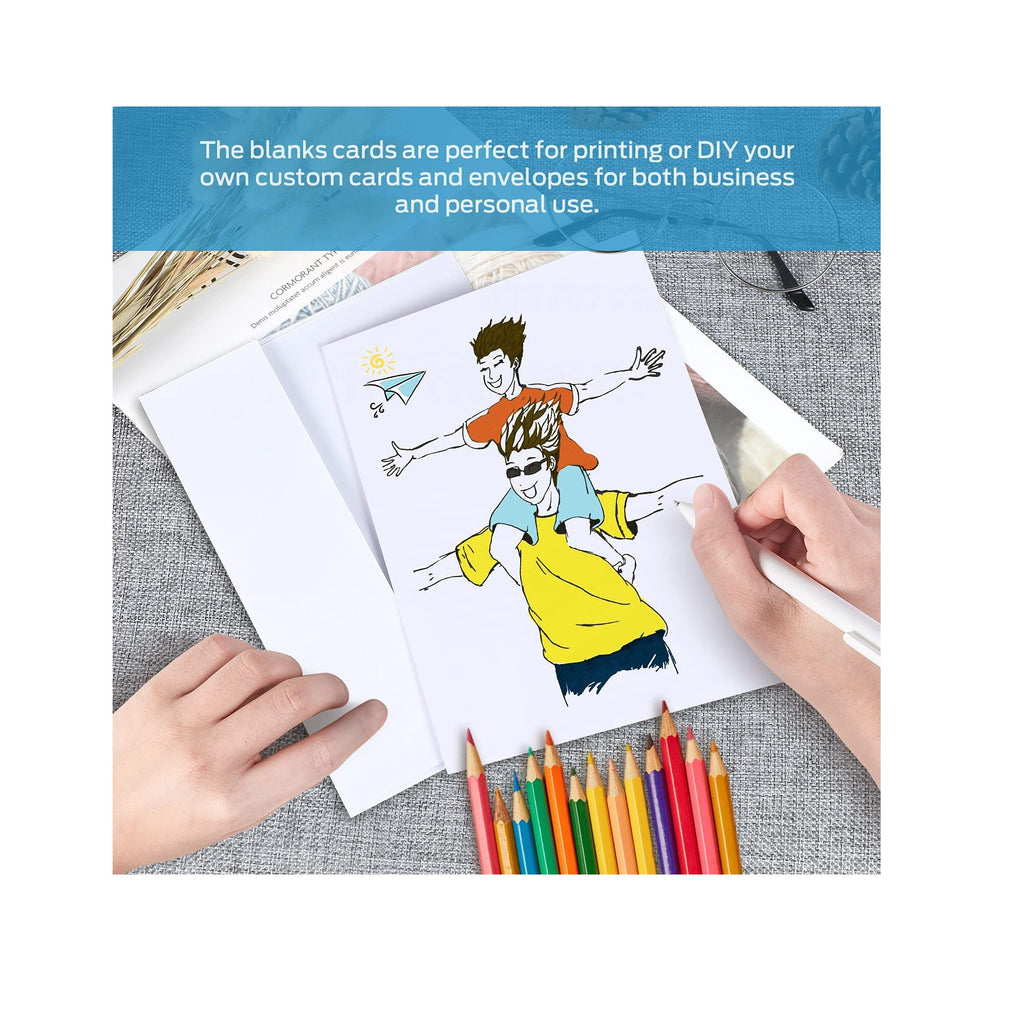 -Blank Greeting Cards & Envelopes Set: Package includes 50pcs 5 x 7 folded blank cards and 50 pcs A7 self-seal envelopes 5.25 x 7.25 inches. Huge number of cards at a low price, you won't run out of cards for a good while! -Professional Quality: Envelopes and cards are made with natural white paper, designed to give each envelope and card a sleeker and more elegant feel. These cards are made of heavyweight strong cardstock. Each card is pre-scored and made of heavy weight 300 GSM cardstock (110lb) that feels thick and sturdy. Envelopes are 120 GSM weight, no see-through worries, protect your information. 100% acid-free and archival safe and are perfect for embossing, calligraphy, drawing and stamping. -Compatible with Inkjet & Laser Printers: When you print on Ohuhu cardstock, your cards will look professionally printed. Ideal for your computerized artwork with LASER, INKJET & COPIER PRINTING, and you can also use them for crafting with markers and watercolors. -Multiple Uses: Excellent for your office stationary, holiday greeting cards, birthdays, weddings, parties, showers, mother's day, father's day, christmas cards thank you cards, and invitations. Save money by making your own Invitations, Announcements. Also perfect for kids to create their own birthday invitations and thank you notes.