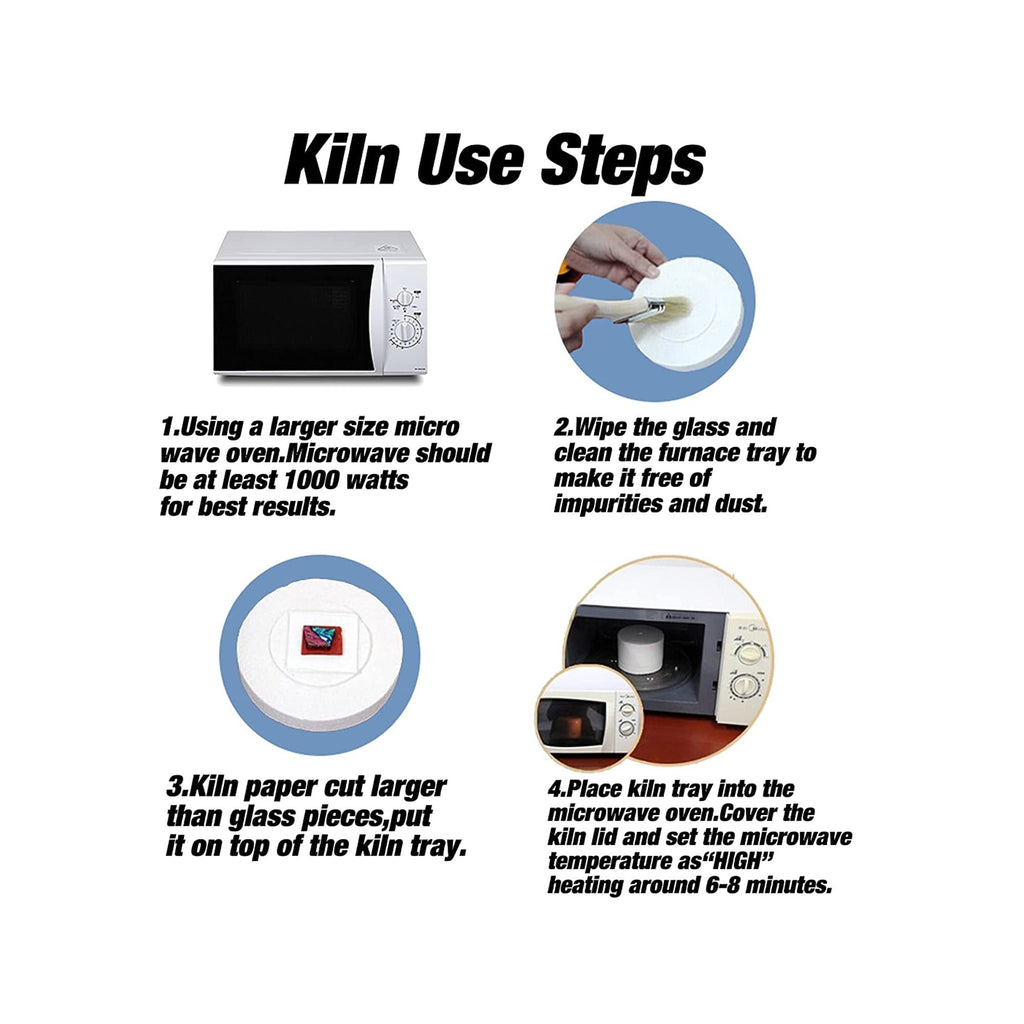 -Microwave kiln glass kits is tool for making DIY glass jewelry. fusing glass in your microwave , create beautiful pendants, earrings and more perfect for fusing jewelry pieces or embellishments in as little as few minutes. -Microwave kiln outter size - Measures 3 1/4" H x 4 1/2" D with an interior fusing platform of 2 3/4 ". -Including 1*kiln and 10*sheets of ceramic fiber kiln paper,1 *Diamond hand file,1* Glass cutter,1 pair of gloves,1 bag opal glass,1 bag Millefiori glass,1 bag Confetti Glass,1 bag Glass frits, 1 bag dichroic glass. -Fuse glass in your microwave - use a microwave oven with power of at least 1000 Watts for the best results. Perfect for fusing jewelry pieces or embellishments in as little as 6 to 8 minutes. -DIY Kiln Advantages - Small and compact, safe, environmentally friendly, energy saving, convenient, fun and easy.