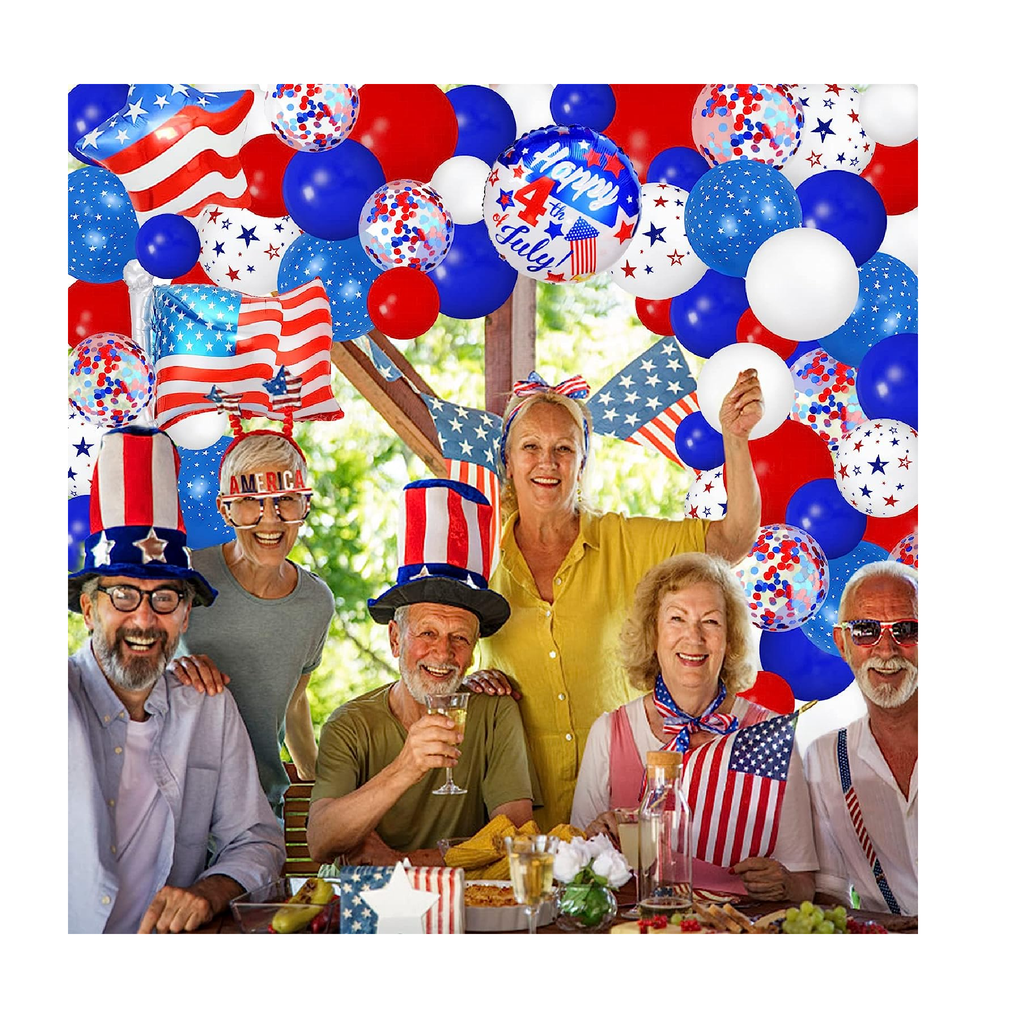 - 4th of July Party Decorations: Our red white and blue balloon garland kit includes 12inch balloons: red x 8, white x 8, blue x 8; red blue confetti balloons x 8; 10inch balloons: red x 10, white x 10, blue x 10; 5inch balloons: red x 15, white x 15, blue x 15; 16inch USA letters balloons x 1, 18inch patriotic stars foil balloons x 4, American flag balloon x 1, 18inch happy 4th of july foil balloons x 2, balloon strip x 1, ribbon x 1, 100 dot glue x 1.
