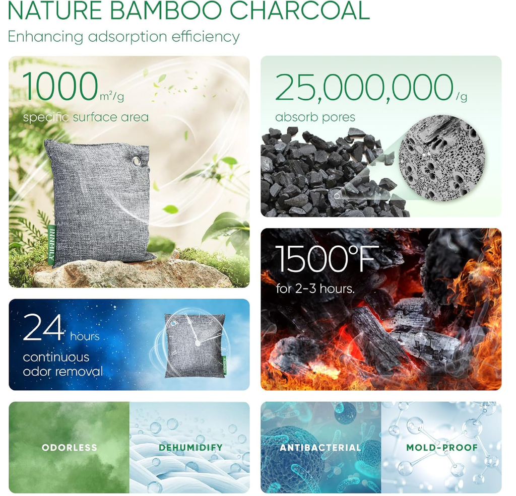 -DISCOVER THE EFFECTIVENESS OF 25,000,000 ADSORPTION PORES - Bamboo charcoal shoe odor elimination undergo meticulous 1500℉ carbonization to create micro and nano-sized pores spanning 2 to 50nmm, resulting in a specific surface area of 1000 square meters per gram. With superior carbon content and abundant pores, bamboo charcoal shoe smell eliminator great at adsorption efficiency. As the premier sneaker and shoe deodorizers, they effortlessly eliminate odors, making them ideal for shoe closets, drawers, and gym bags.
