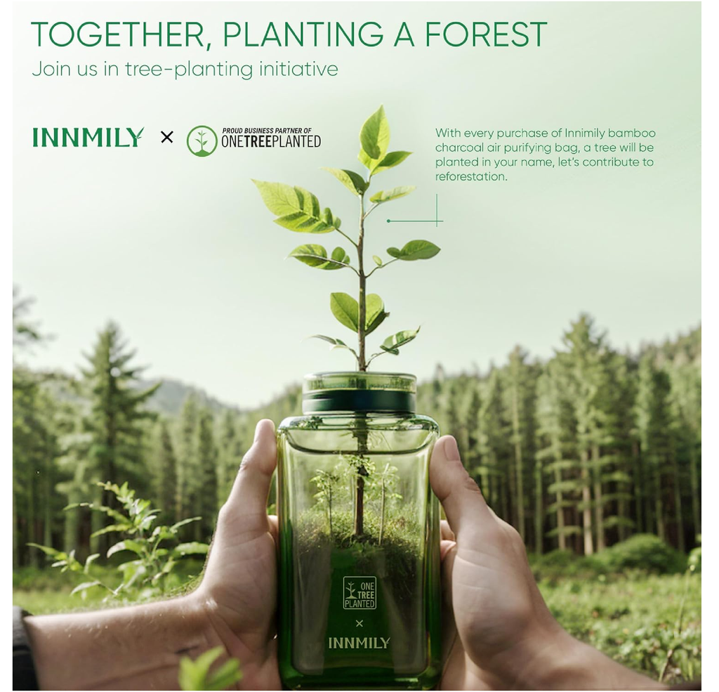 -TOGETHER, PLANTING A FOREST - Partner with us in our tree-planting endeavor! For each purchase of our Innimily bamboo charcoal air purifying bag, a tree will be planted in your name, supporting reforestation and aligning your wellness with environmental stewardship. A natural solution that not only captures odors but also fosters sustainability. Innmily connects you with nature's freshness, backed by our no question asked money-back guarantee on our charcoal air freshening bags.