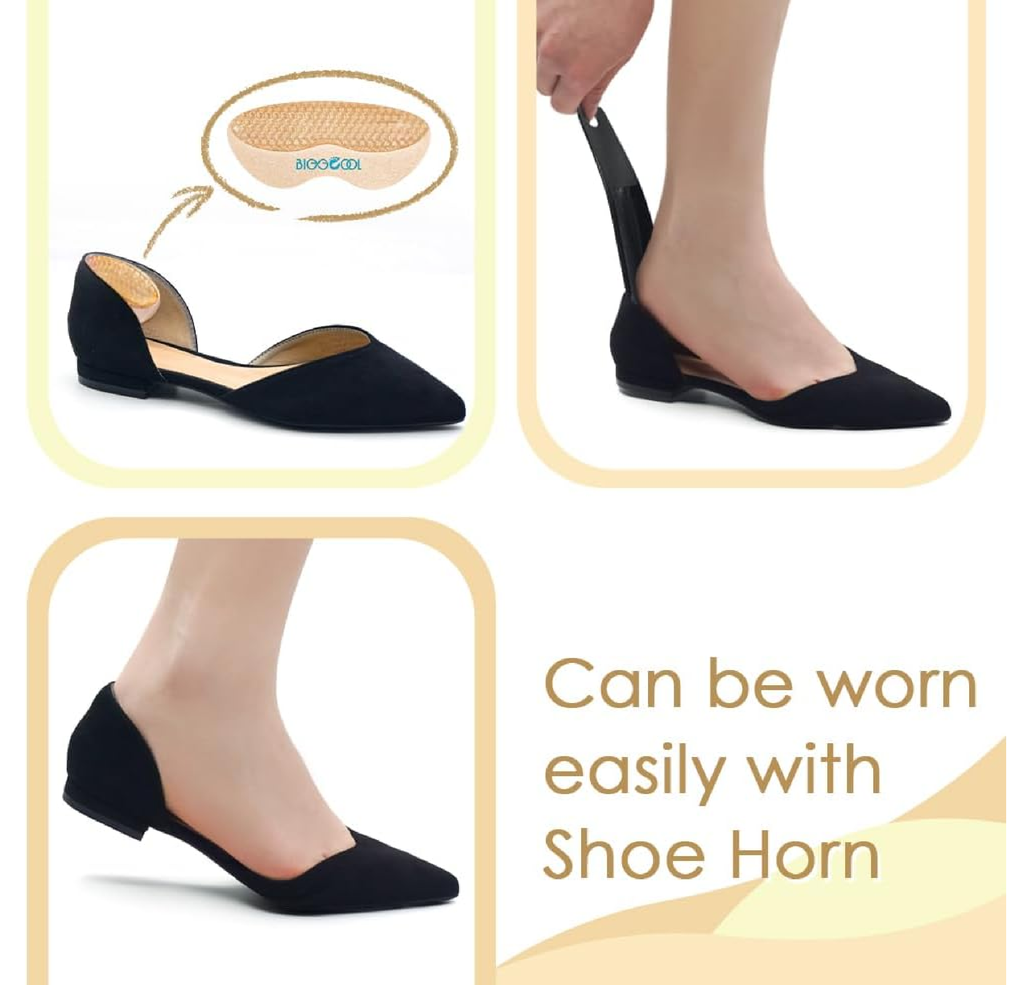 -Perfect Combination:  The BIGGCOOL package contains 2 pairs of forefoot pads, 2 pairs of heel pads and a shoe horn. The metatarsal pad is effective in dispersing the stress of walking or standing; the heel grips liner is specifically designed for your oversized or loose shoes, reducing the pain of blisters caused by friction.