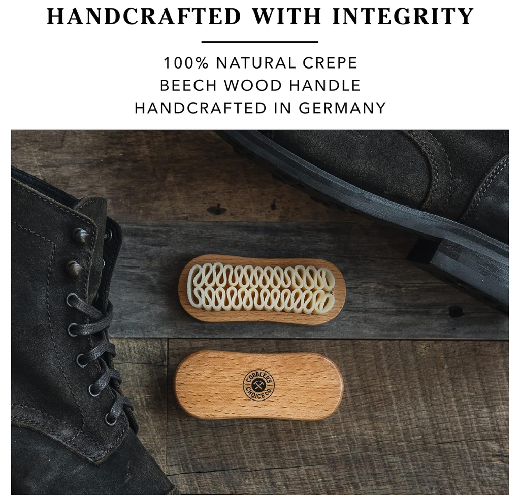 -PREMIUM SUEDE AND NUBUCK BRUSH -- Effortlessly restore the nap of your suede and nubuck with the Cobbler's Choice Suede and Nubuck Brush. Made in Germany with 100% Natural Crepe on a beautiful Beech Wood handle.