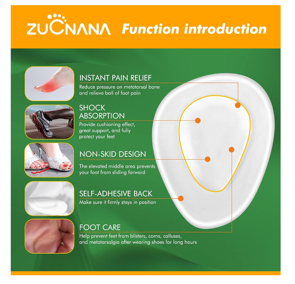 -FOOT PAIN RELIEF: The ergonomic design of ZUCNANA ball of foot cushions effectively reduces pressure on metatarsal bones and relieves forefoot pain from Morton’s Neuroma, Callus, Plantar Fasciitis, and Bunions.