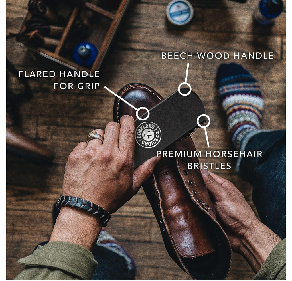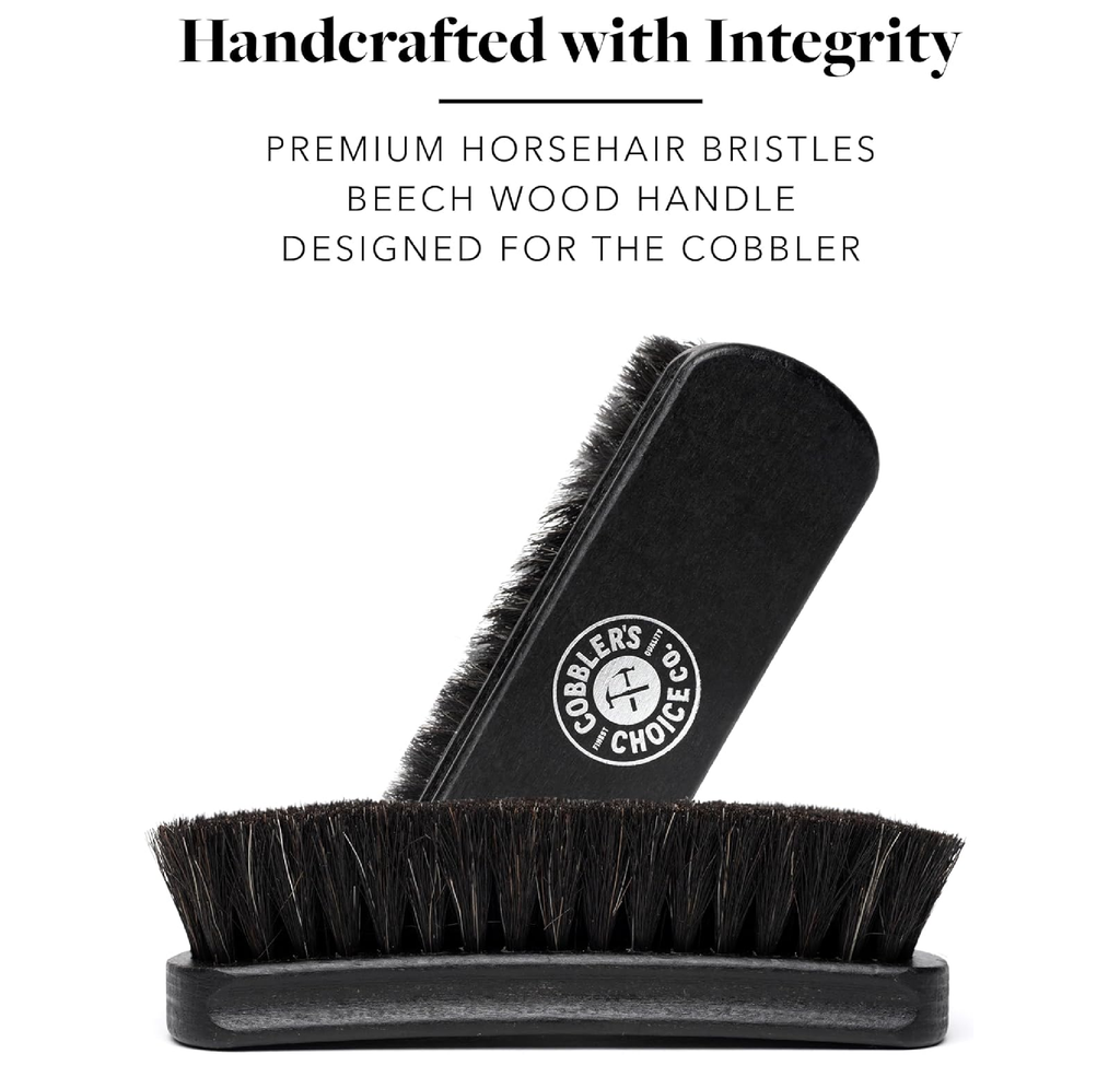 -Buff, shine, and restore the lusture of your leather with the Cobbler's Choice Shoe Brush made with premium Horsehair Bristles on an Beech Wood Handle.