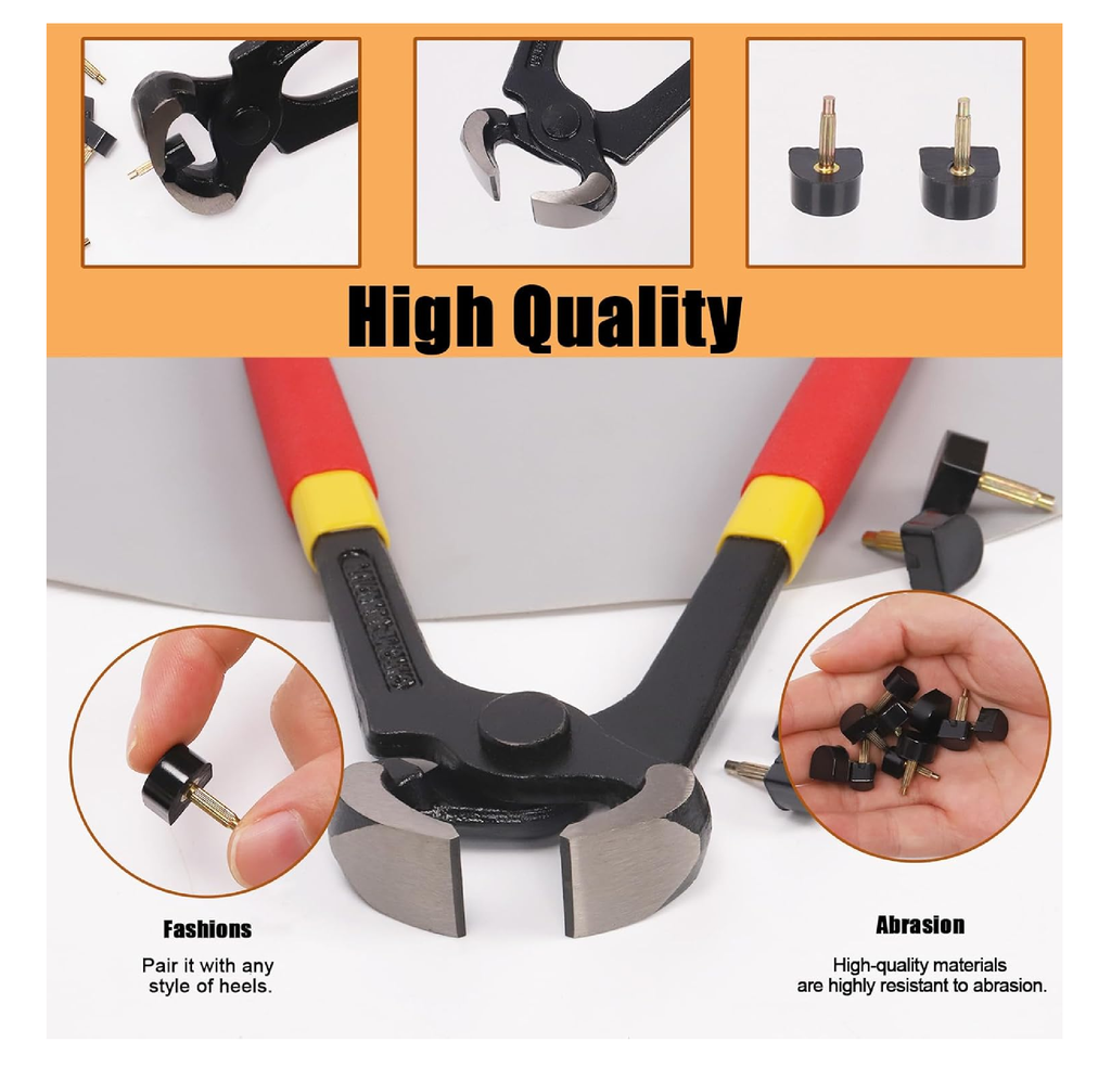-Nice Heel Tip Removal Pliers:  Made of quality steel with high hardness and rust resistance. This stiletto remove pliers make it easy to remove worn-out tips and install new ones without causing any damage to your shoes. Bedsides, its anti-slip handle with ergonomic design provide you with a comfortable grip during repair process.