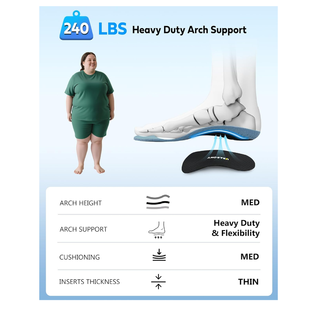 -Heavy Duty Yet Flexible Support: These arch support shoe inserts for men and women are designed for those who need strong arch support, heavy duty support for 240+lbs. Carbon Fiber elastic arch support insole mimics your Natural Arch, bearing the weight of your body and absorbing impact produced during locomotion.