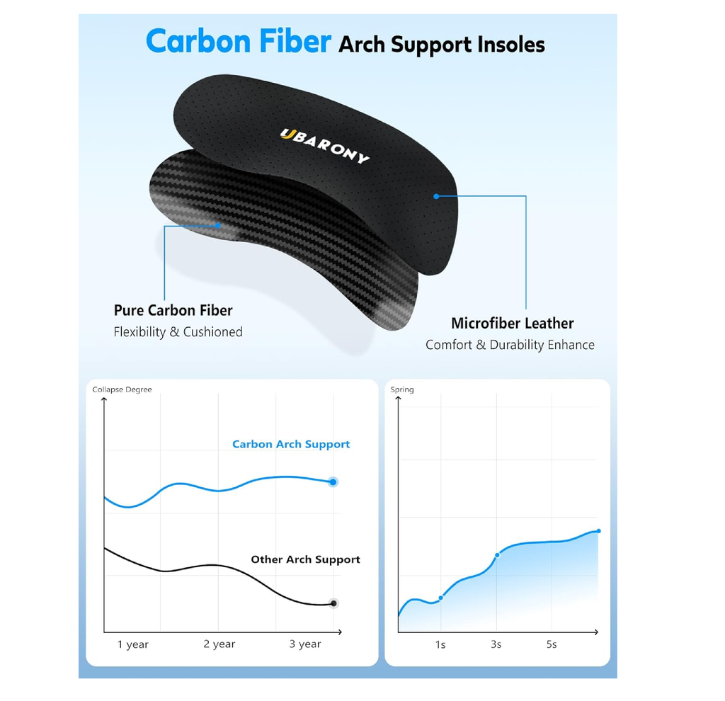 -Why Carbon Fiber: Crafted with high-strength, ultralightweight carbon fiber, these arch support inserts weigh 50% less than traditional materials, ensuring all-day comfort without the bulk.