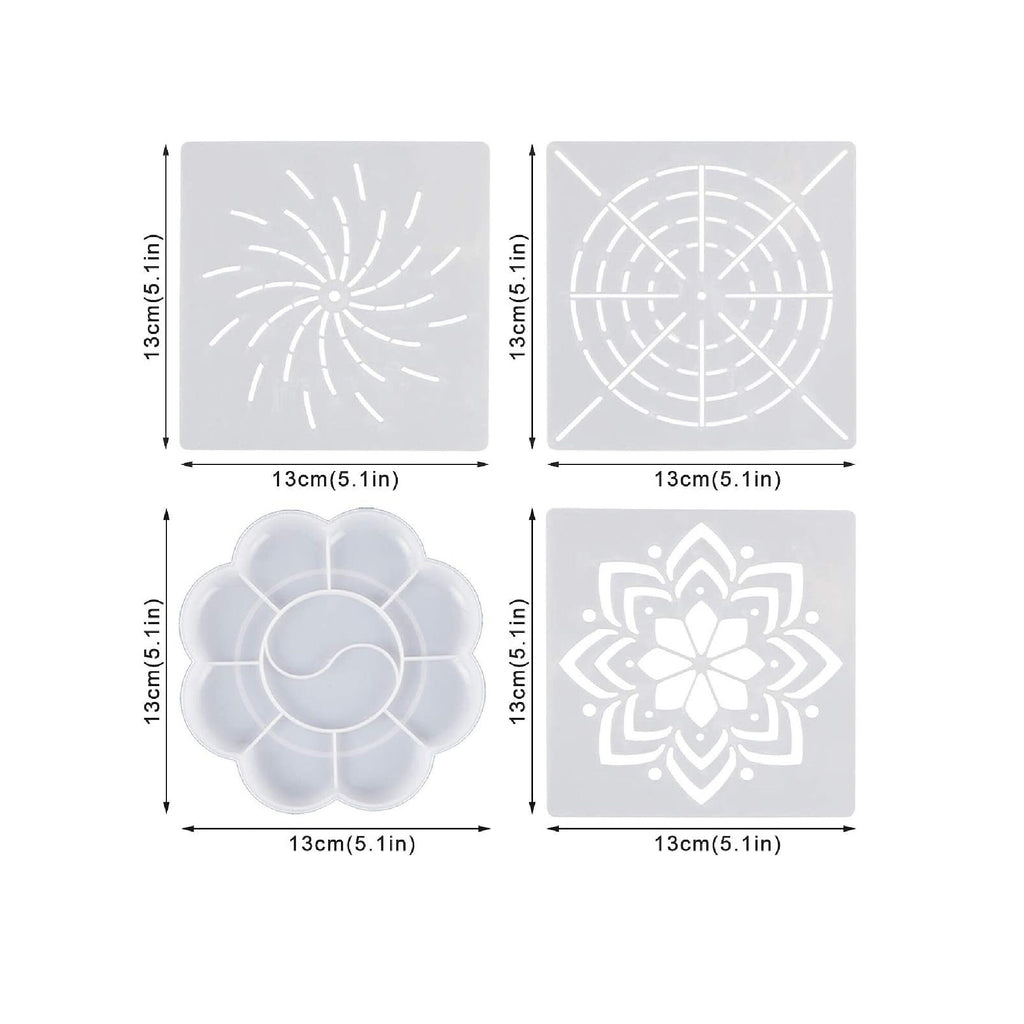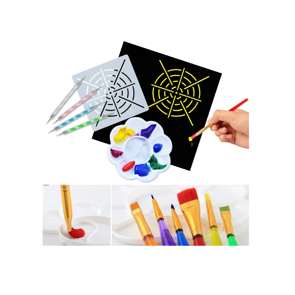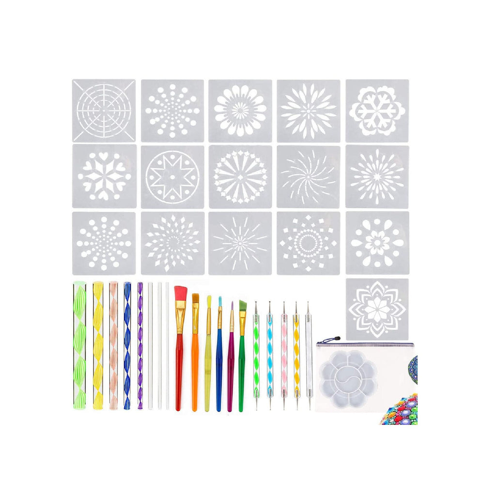 -Package includes 16 different sized plastic stencils5.1*5.1 IN, 8 x acrylic rods in different diameters, 5 x double-sided dotting tools in different diameters, 6 x paintbrushes, 1 x paint tray. Sufficient for your painting or decoration needs.