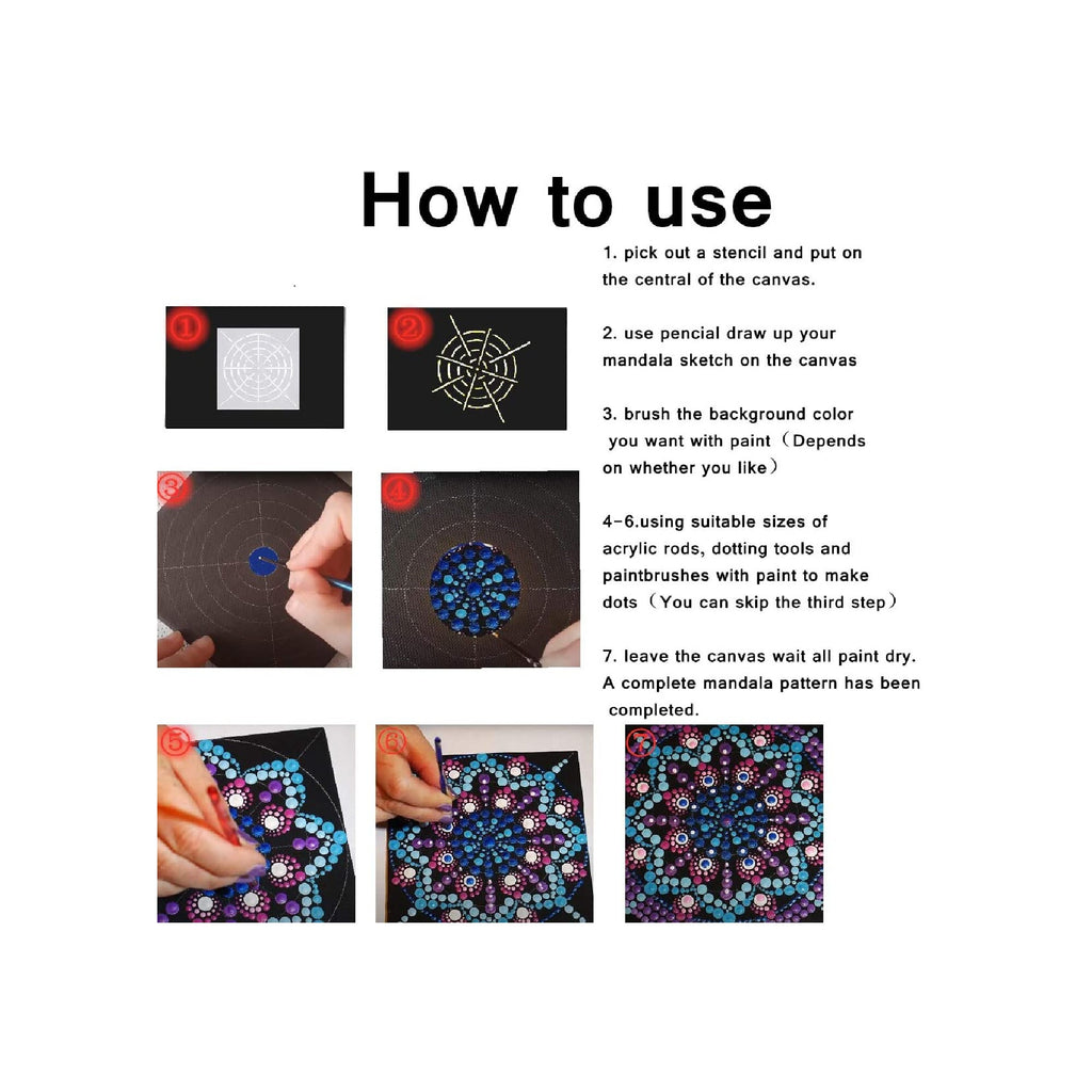 -Great dotting tools: Flat dotting tools for dot painting let you paint perfect dots for creating mandala art on rocks, paper, stretched canvas or many other surfaces to create beautiful art. Easy to use and reusable: Draw a mandala contour with the plastic stencils, then use the dotting tool to create your favorite mandala pattern. The dotting tools and stainless steel ball stylus are easy to clean with a damp cloth or paper towel; you will love it. -Widely usage: suitable for rocks paintings, nail art or decoration, make dots patterns and any other craftworks, fit for both professional and home use. -1. pick out a stencil and put on the central of the canvas. 2. use pencial draw up your mandala sketch on the canvas 3. brush the background color you want with paint(Depends on whether you like) 4-6.using suitable sizes of acrylic rods, dotting tools and paintbrushes with paint to make dots(You can skip the third step) 7. leave the canvas wait all paint dry. A complete mandala pattern has been completed.
