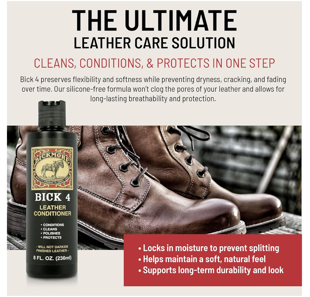-PREMIUM LEATHER CONDITIONER SINCE 1882: Bickmore Bick 4 Leather Conditioner cleans, polishes, and protects all types of leather products such as boots, shoes, jackets, purses, handbags, furniture & upholstery, car interiors, motorcycle seats, equestrian equipment such as saddles and tack, any exotic leather products, and more. Our time tested formula is proven to extend the life of all your most precious leather products.