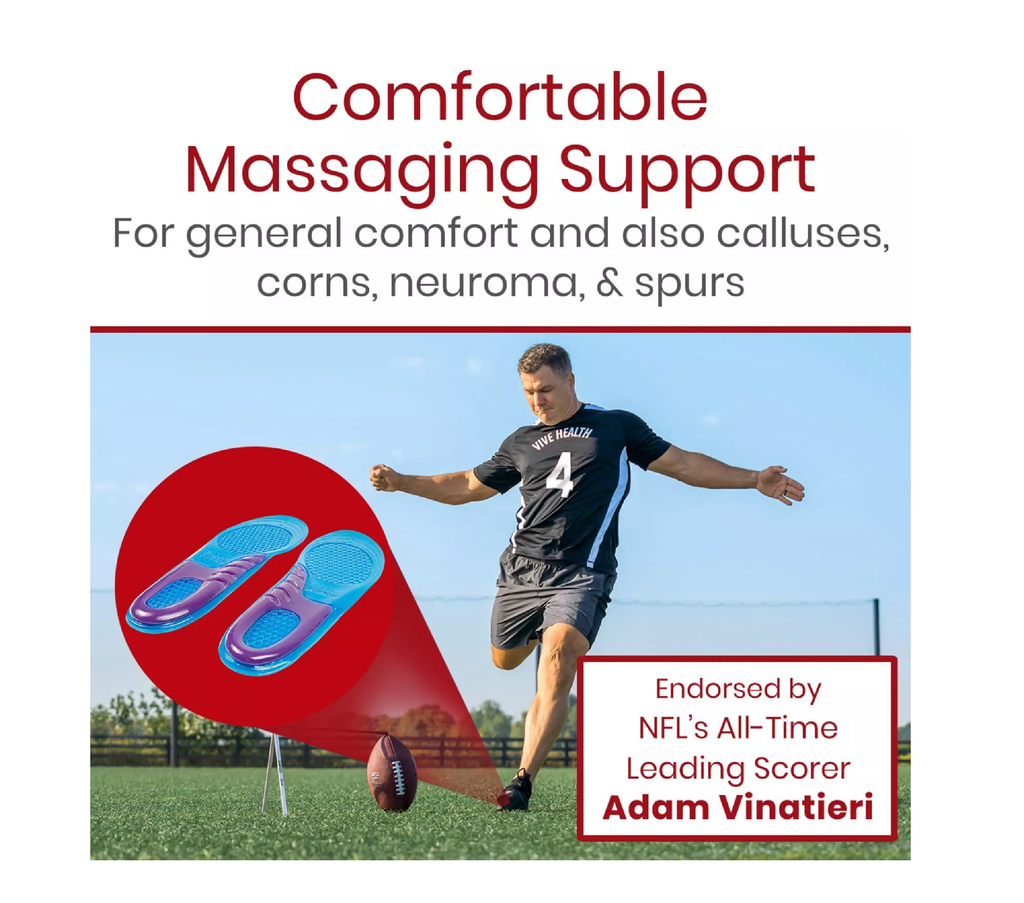 VERSATILE FIT FULL-LENGTH INSOLE: Easily worn with most shoe styles, the versatile gel inserts can be trimmed for a customized fit. The full-length insoles have a textured base to grip the inside of your shoe, eliminating slipping for greater stability and comfort. Also relieving pain and pressure caused by spurs, corns, and neuroma, the massaging gel insoles are perfect for individuals who are on their feet all day.