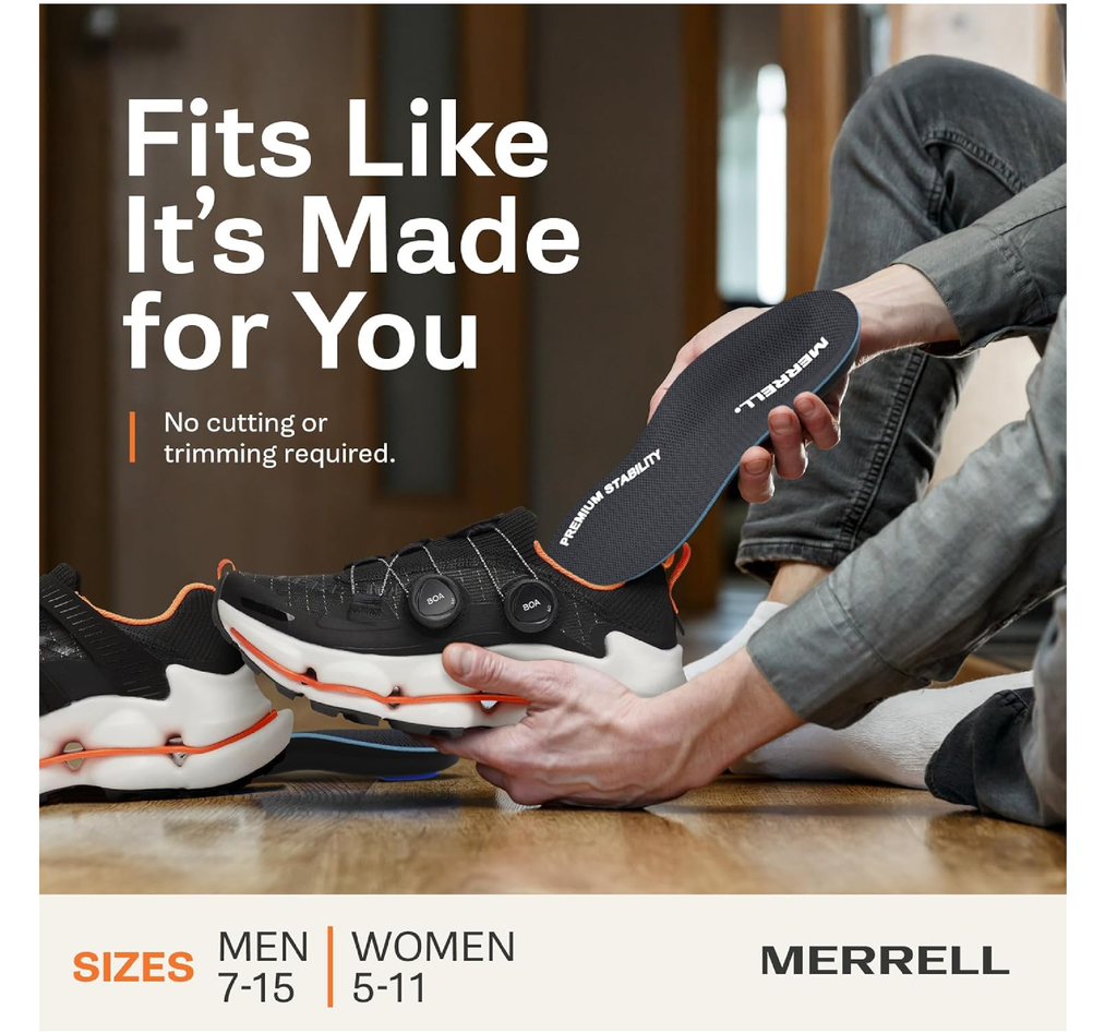 PREMIUM STABILITY INSOLES – Want more stability for long days on your feet? MERRELL Kinetic Fit PREMIUM STABILITY orthotic inserts for women deliver advanced stability and comfort for walking, trail running, and hiking. Available in exact sizes. No trimming required.
