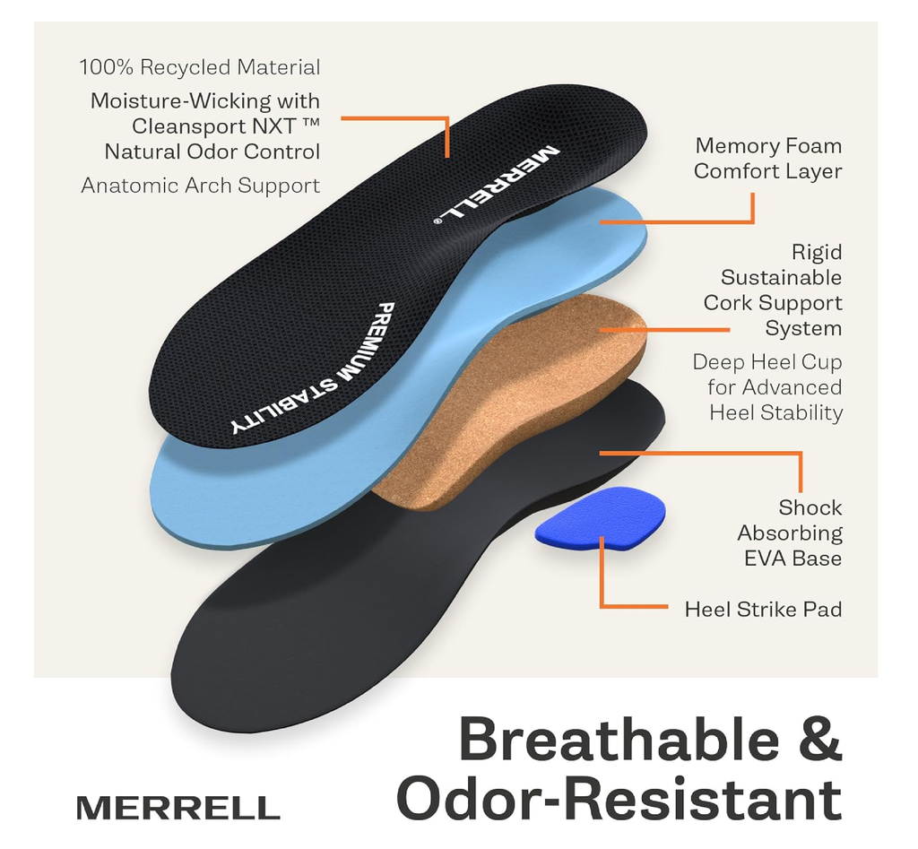 FOOT PROTECTION & SHOCK ABSORPTION – Feel the MERRELL difference in every step. Whether you're working, hiking, or looking for insoles for women standing all day, the EVA base and heel strike pad absorb impact to reduce back pain and stress on your joints. Great for long hours outdoors.