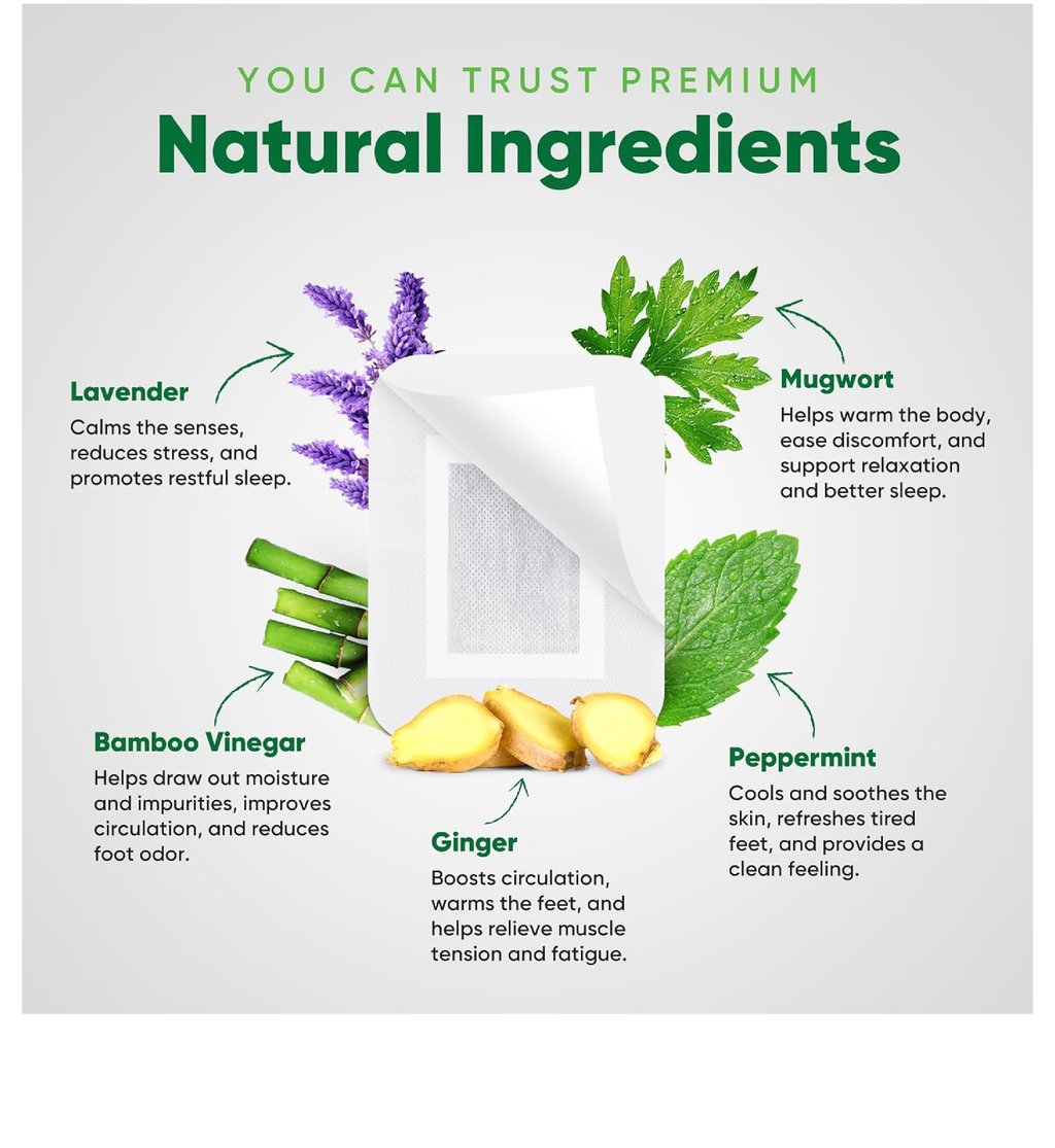 -Relief from Daily Strain and Stress: Infused with pure ginger oil, bamboo vinegar powder, and herbal mugwort, these foot pads help adults find comfort and renewed vitality, promoting relaxation and a sense of well-being.