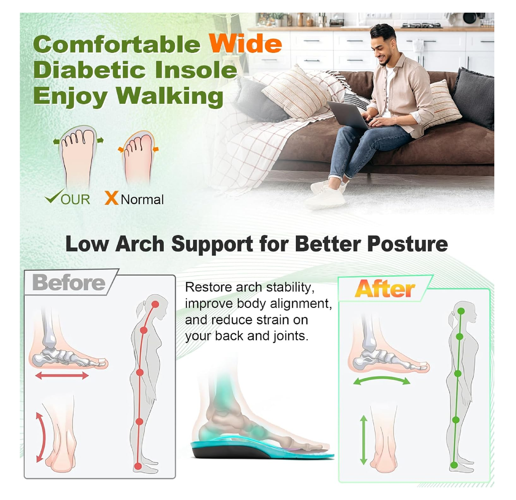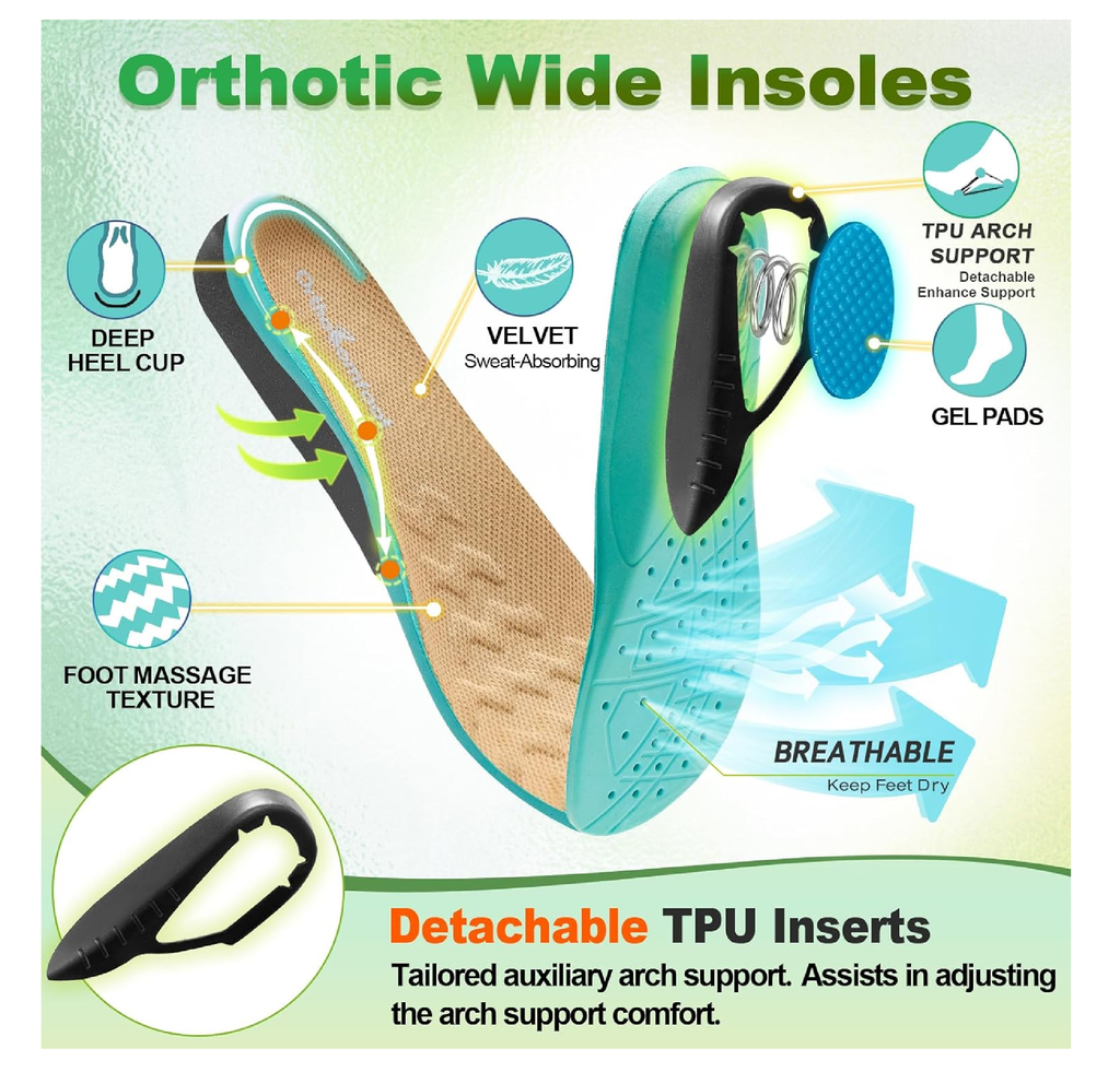 -Wide Feet & GEL Cushioning: Orthotic insoles designed specifically for 3E-6E wide shoes. The GEL-cushioned heel absorbs shock effectively, reducing joint impact and making every step feel light and effortless, as if walking on clouds.