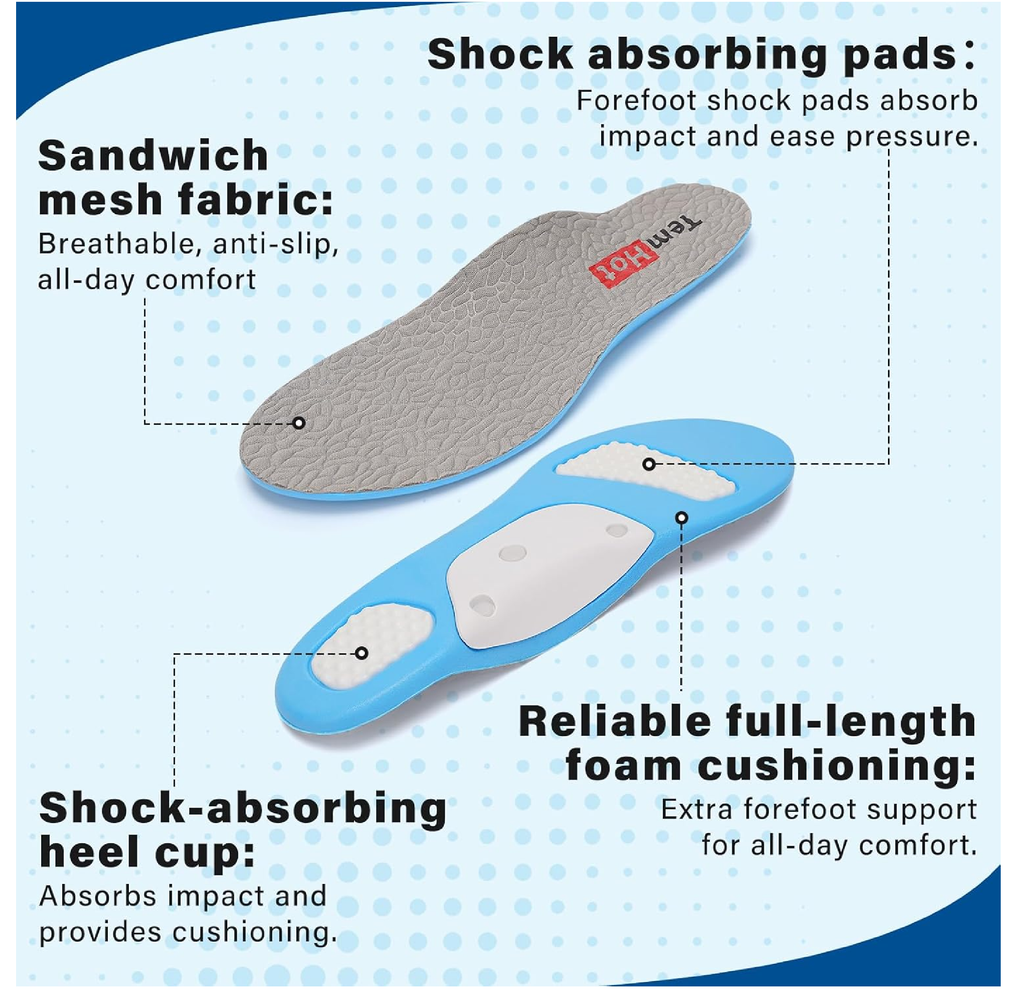 -Non-slip, durable,sturdy support: Made of durable PU, these lightweight insoles provide arch support,pressure relief,and shock absorption.They disperse heel pressure,ensure proper foot and ankle alignment,and relieve pain in feet,knees,and back for all-day comfort.