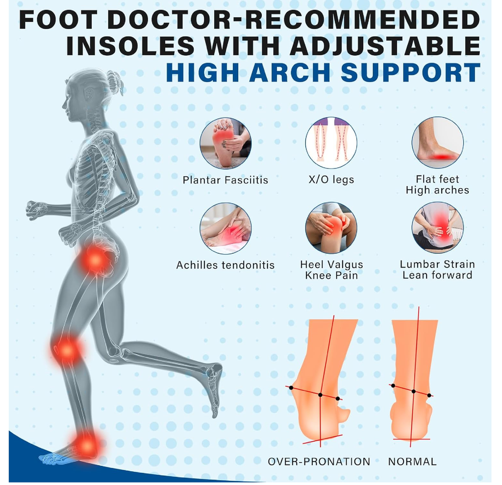 -Plantar Fasciitis Insoles:Relieve flat feet, high arches, knee pain, foot discomfort, overpronation, supination, and improper force distribution. Arch support improves foot and leg alignment, reduces pressure from bunions and arthritis, and helps ease plantar fasciitis and Achilles tendonitis.