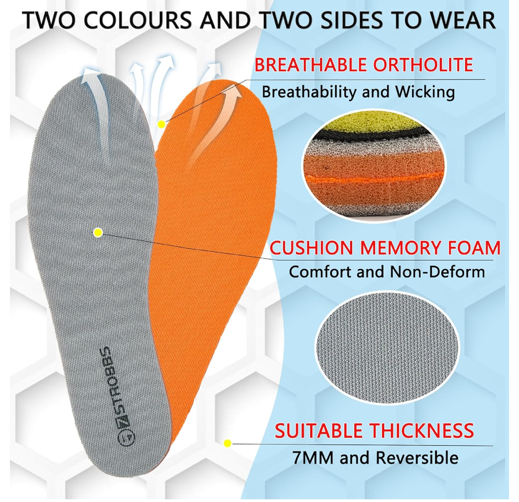 -Reversible Design for Longevity: Get double the life out of these memory foam insoles. With a reversible design, one pair can be used as two—flip them over to extend their freshness, thanks to the sweat-wicking, odor-neutralizing underside.
