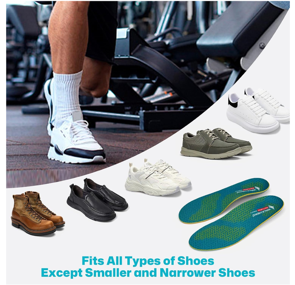 -Anti-Fatigue Design - 4-Layer Cushioning System:  WalkHero work inserts feature full-length foam, high-rebound EVA, a forefoot EVA pad and PU heel cushioning to combat tired achy feet & legs. The foam & EVA layers offer excellent shock absorption, reducing the impact on muscles and joints when you are walking on hard surfaces. The forefoot pad minimizes fatigue in the metatarsal area, and the heel cushioning absorbs impact, reducing stress on ankles, knees and lower back.